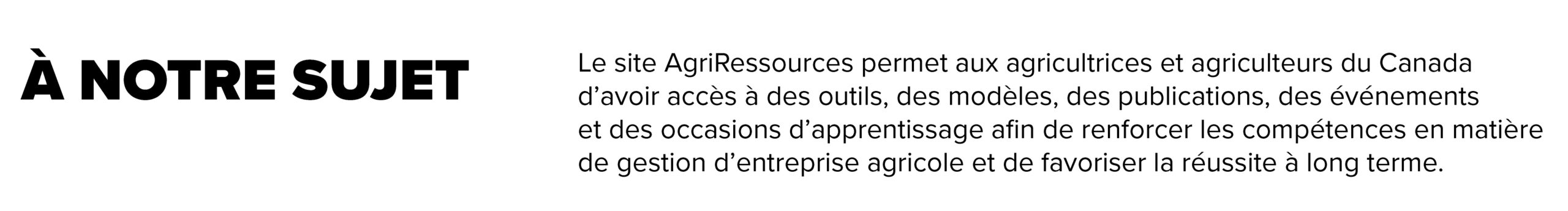Un ensemble de ressources de gestion d’entreprise agricole conçues pour soutenir le volet affaires de l’agriculture. Les ressources sont choisies avec soin en vue d’orienter la planification, la prise de décisions et l’apprentissage tout au long de la vie, et ce, de manière à aider les agricultrices et agriculteurs à atteindre leurs objectifs d’affaires. Qu’il s’agisse d’outils de planification d’entreprise et de gestion financière, d’événements d’apprentissage ou de programmes de soutien, le site AgriRessources rassemble des renseignements pratiques et pertinents à l’intention des agricultrices et agriculteurs.